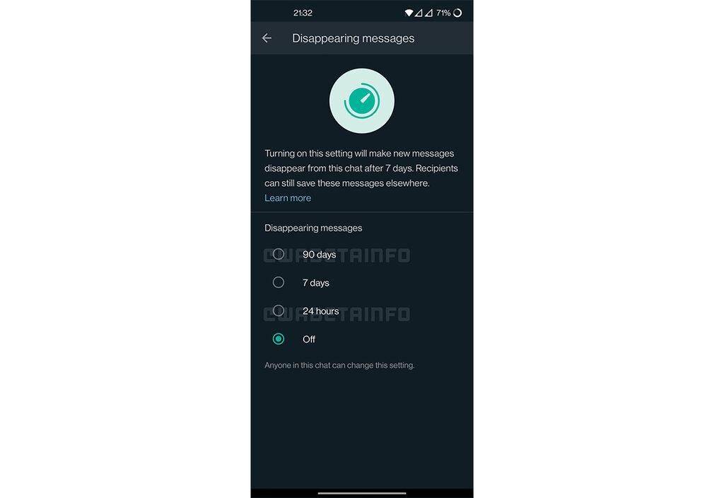 WhatsApp Android ve iOS uygulamasını daha iyi bir hale getirmek için çalışmalarını sürdürüyor. Şirket bu çalışmalar kapsamında çok kısa bir süre önce "Süreli Mesajlar" veya diğer adıyla "Kaybolan Mesajlar" adında bir özellik ile karşımıza çıkmıştı hatırlarsanız. WhatsApp, şimdi ise mesajları belirli bir süre sonra otomatik olarak silen bu özellik için yeni bir seçenek geliştiriyor.