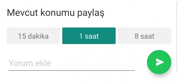 Bu seçeneğe tıkladıktan sonra resimdeki gibi ek bir seçenek ortaya çıkar ve kaç saat boyunca bu konumu paylaşmak istediğinizi bu ekrandan seçmenize olanak sunar.
