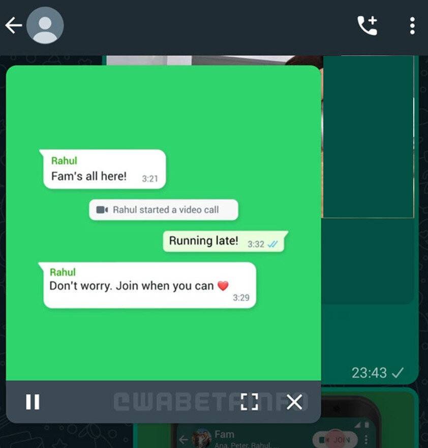 WhatsApp, güncellenen Resim İçinde Resim özelliği sayesinde YouTube videolarının önde ya da arkada oynaması seçilebiliyor. Yani aslında videolar artık bir köşede oynamak yerine arka planda oynatılabiliyor. Bu sayede önde ise ufak bir pencerede mesajlaşma devam edebiliyor.