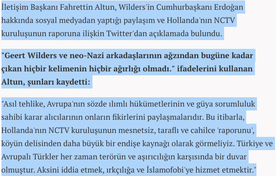 AK Parti Sözcüsü Ömer Çelik, Wilders'in Cumhurbaşkanı Erdoğan hakkında sosyal medyadan yaptığı paylaşıma ilişkin Twitter'dan açıklamada bulundu. Açıklamasında, "Cumhurbaşkanımıza saldıran bu faşist, II. Dünya Savaşı yıllarında yaşasa, şimdi lanetle anılan bir Nazi olurdu." ifadesini kullanan Çelik, şunları kaydetti: Ankara Cumhuriyet Başsavcılığı'ndan yapılan açıklamada şu ifadelere yer verildi; Hollanda Temsilciler Meclisi Üyesi Geert Wilders nın 15 02 2021 tarihinde Sayın Cumhurbaşkanımız Recep Tayyip Erdoğan hakında Fotoğraf ve yazılı hareket içeren Twitter paylaşımlarından dolayı Ankara Cumhuriyet Başsavcılıgımızca soruşturma başlatılmıştır.”