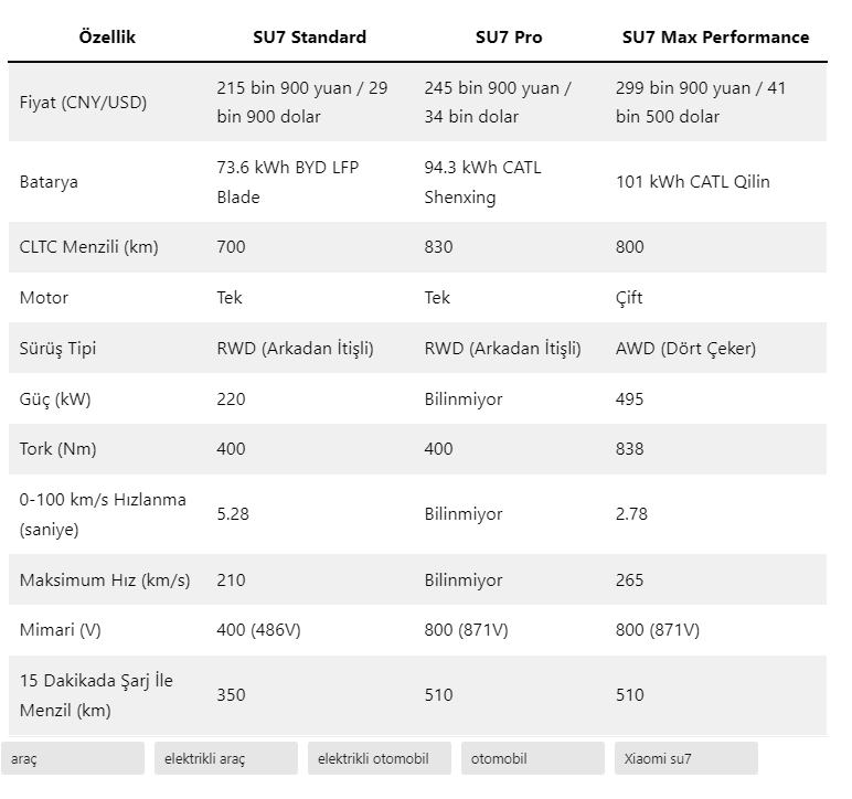 Xiaomi SU7 için Standart, Pro ve Max Performance için üç seçenek bulunuyor. Bunlar sırasıyla 29 bin 900 dolar, 34 bin dolar ve 41 bin 500 dolara tekabül ediyor. Menzilleri ise sırasıyla 700 km, 830 km ve 800 km şeklinde.