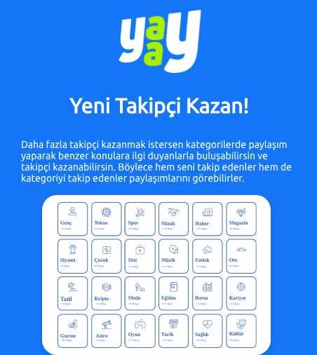 Daha sonra takip etmek istediğiniz genç, tekno, spor, mizah, haber magazin, siyaset, çocuk, diziz gibi kategorileri seçebilirsiniz. Daha sonra takip etmekten hoşlanacağınız bir kaç hesap önerilerinin bulunduğu sayfa açılacaktır. Buradan takip etmek istediğiniz hesapları seçebilir ya da direk olarak tercih yapmadan atlayabilirsiniz. Bu işlemlerden sonra Yaay ana sayfasına ulaşmış olacaksınız.