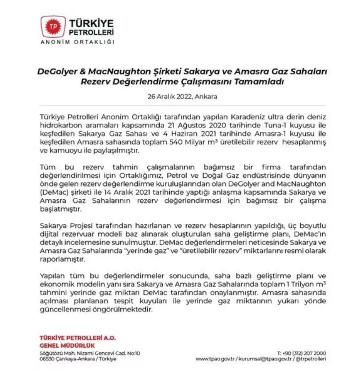 Tüm bu rezerv tahmin çalışmalarının bağımsız bir firma tarafından değerlendirilmesi için Ortaklığımız, Petrol ve Doğal Gaz endüstrisinde dünyanın önde gelen rezerv değerlendirme kuruluşlarından olan DeGolyer and MacNaughton (DeMac) şirketi ile 14 Aralık 2021 tarihinde yaptığı anlaşma kapsamında Sakarya ve Amasra Gaz Sahalarının rezerv değerlendirmesi için bağımsız bir çalışma başlatmıştır.
