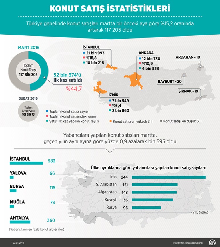Satış sonucu el değiştiren konut sayısı, martta bir önceki aya göre yüzde 15,2 artarak 117 bin 205 oldu. Konut satışlarında İstanbul 21 bin 993 ile en yüksek paya (yüzde 18,8) sahip oldu. Yabancılara konut satışında ise martta geçen yılın aynı ayına göre yüzde 0,9 azalışla bin 595 olurken, satışların yaklaşık yarısı Irak, Kuveyt, Suudi Arabistan ve Afganistan vatandaşlarına yapıldı.