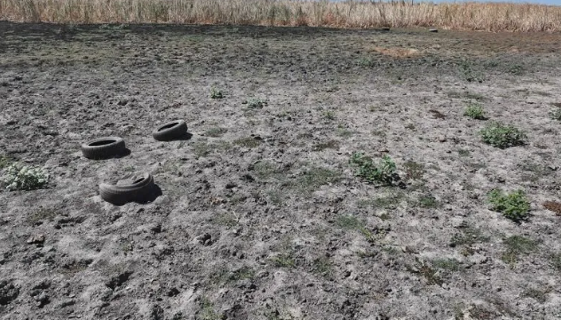 Kuruma nedeniyle göletin tabanında çatlaklar oluştu, bir bölümü sazlıklarla kaplandı.