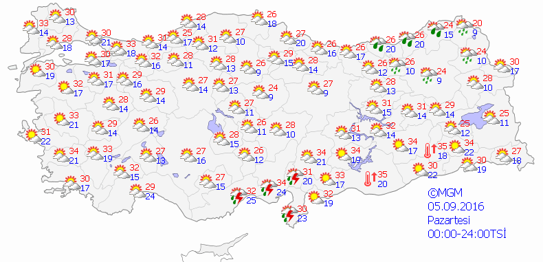Yapılan son değerlendirmelere göre, ülkemizin güney, iç ve doğu kesimlerinin parçalı, yer yer çok bulutlu, Doğu Karadeniz, Erzurum, Kars, Ardahan, Antalya, Mersin, Adana, Osmaniye, Afyonkarahisar ile Isparta ve Kütahya'nın doğusu, Erzincan'ın kuzeyi ve Hatay'ın kıyı kesimlerinin yerel olmak üzere sağanak ve gök gürültülü sağanak yağışlı, diğer yerlerin az bulutlu geçeceği tahmin ediliyor.