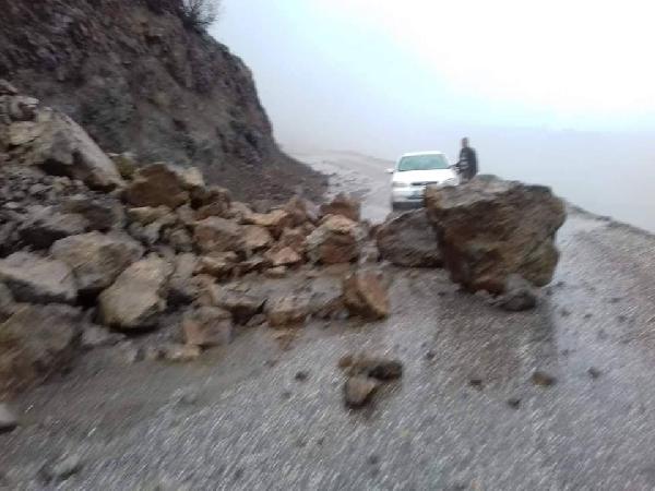 Adıyaman Gerger'e bağlı Şengil Köyü yakınlarında 2 gündür aralıksız devam eden yağmur nedeniyle gevşeyen kayalar karayoluna düştü