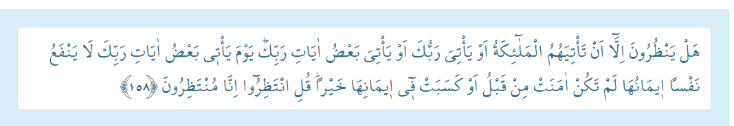 “(İnanmak için) ille de kendilerine meleklerin gelmesini veya rabbinin gelmesini ya da rabbinden bazı işaretlerin gelmesini mi bekliyorlar? Daha önce inanmamış yahut inancı kendisine iyilik kazandırmamış kimseye, rabbinden bazı işaretler geldiği gün iman etmesi fayda sağlamaz. De ki: “Bekleyin! Şüphesiz biz de beklemekteyiz.”