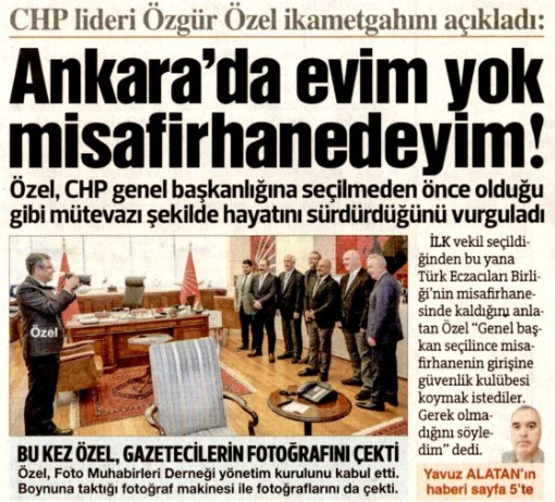 Türkiye Foto Muhabirleri Derneği'nin yöneticilerini kabul eden Özel, "İlk vekil olduğumdan bu yana misafirhanede kalıyorum. Hala Adana Milletvekili Burhanettin Bulut ve Türk Eczacıları Birliği Başkanı Arman Üney ile aynı misafirhanede kalıyorum. Genel başkan seçilince misafirhanenin girişine güvenlik kulübesi koymak istediler. Gerek olmadığını söyledim." dedi.