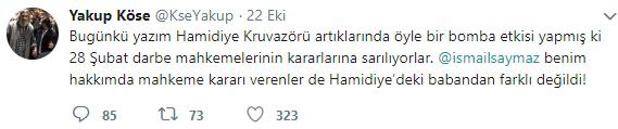 “Bugünkü yazım Hamidiye Kruvazörü artıklarında öyle bir bomba etkisi yapmış ki 28 Şubat darbe mahkemelerinin kararlarına sarılıyorlar. @ismailsaymaz benim hakkımda mahkeme kararı verenler de Hamidiye’deki babandan farklı değildi!”