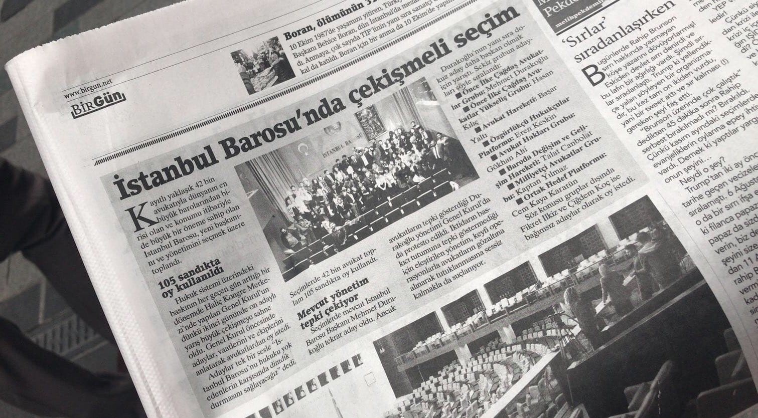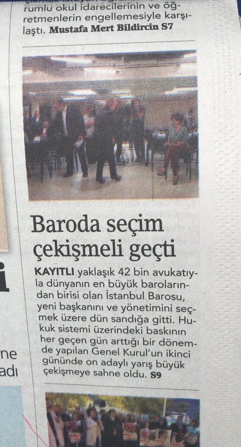 Haberin seçimlerin çok çekişmeli geçtiği algısıyla verildiği dikkat çekerken, 1. sayfadaki “Kayıtlı yaklaşık 42 bin avukatıyla dünyanın en büyük barolarından birisi olan İstanbul Barosu, yeni başkanını ve yönetimini seçmek üzere dün sandığa gitti. Hukuk sistemi üzerindeki baskının her geçen gün arttığı bir dönemde yapılan Genel Kurul’un ikinci gününde on adaylı yarış büyük çekişmeye sahne oldu” ifadeleri dikkat çekti.