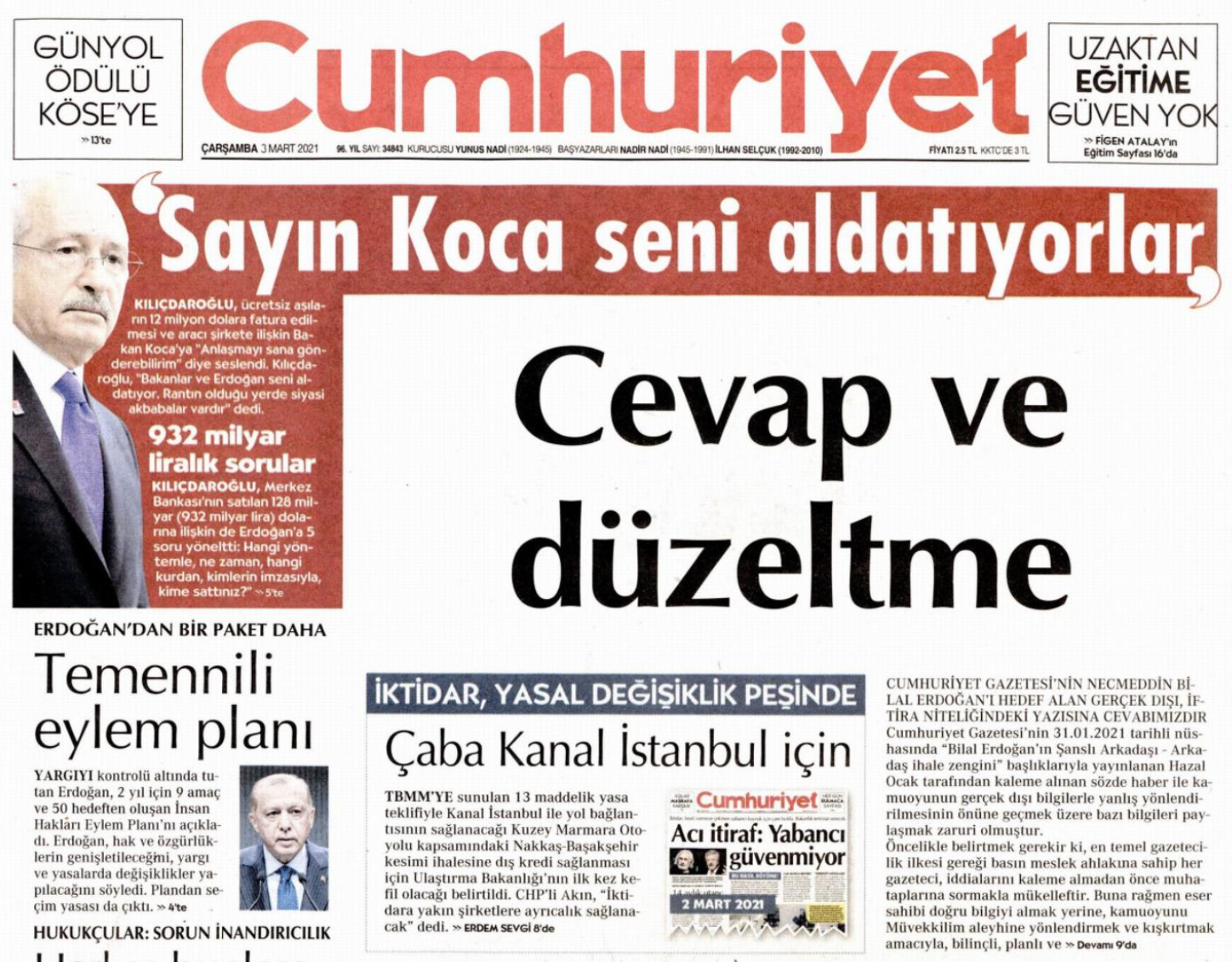 Yalanları yüzünden tekzip bültenine dönen Cumhuriyet, Erdoğan ailesine attığı iftira yüzünden bir düzeltme daha yayınlamak zorunda kaldı.