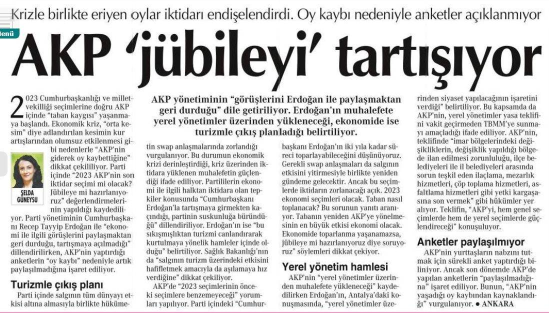Türlü yalan ve iftiralarla AK Parti iktidarını karalamayı kendine görev edinen CHP yandaşı Cumhuriyet gazetesinin bir yalanı daha elinde patladı. Cumhuriyet gazetesi "AKP 'jübileyi' tartışıyor" başlığıyla servis ettiği algı dolu haberinde AK Parti'nin giderek oy kaybettiğini ve bu nedenle yaptırdığı anketlerin sonuçlarını paylaşmadığını iddia etti.