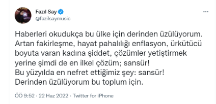 Twitter hesabından paylaşımda bulunan piyanist Fazıl Say, Dezenformasyon Yasası'nı hedef aldı.