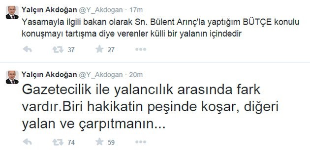 Başbakan Yardımcısı Yalçın Akdoğan Twitter hesabından yaptığı açıklamada konuşmalarını tartışma şeklinde verenlerin külli bir yalan içinde olduğunu ifade etti. Akdoğan, Twitter'dan "Yasamayla ilgili bakan olarak Sn. Bülent Arınç'la yaptığım bütçe konulu konuşmayı tartışma diye verenler külli bir yalanın içindedir" diye yazdı.