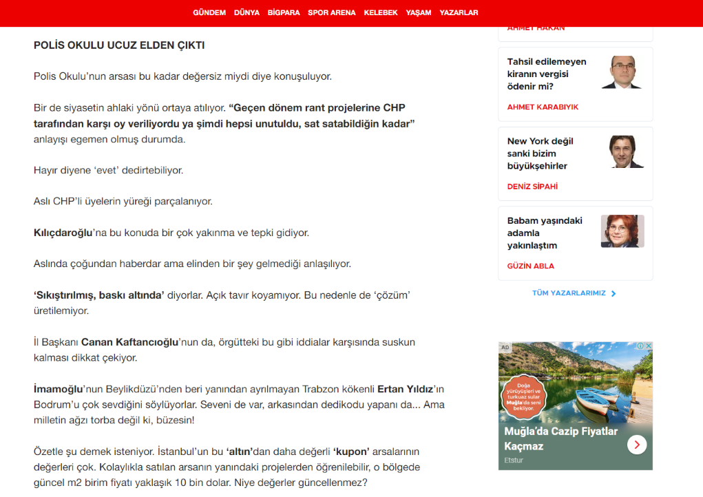 Hürriyet gazetesi yazarı Yalçın Bayer, İstanbul’un Etiler semtindeki polis okulu arazisinin CHP'li İBB Başkanı Ekrem İmamoğlu yönetimindeki İstanbul Büyükşehir Belediyesi’nin (İBB) iştiraki KİPTAŞ tarafından satılmasına isyan etti.