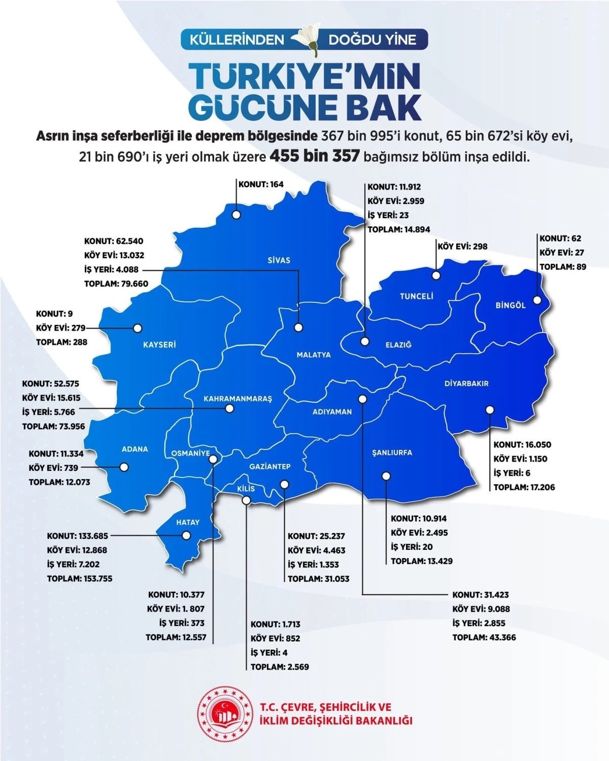 6 Şubat depremlerinin ardından başlatılan Asrın İnşa Seferberliği kapsamında 18 ilde 455 bini aşkın konut, köy evi ve iş yeri tamamlanarak hak sahiplerine teslim edildi. Türkiye, tarihinin en büyük yeniden inşa hamlesine imza attı.
