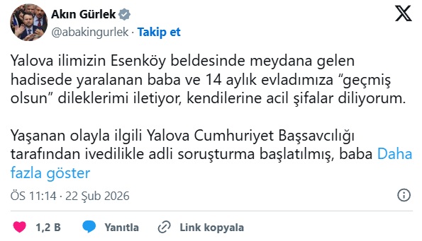 Olayın sosyal medyada ve basında geniş yankı bulmasının ardından Adalet Bakanı Akın Gürlek bir açıklama yaptı. Bakan Gürlek, baba ve 14 aylık bebeğe geçmiş olsun dileklerini ileterek, saldırganın tutuklandığını ve soruşturmanın tüm yönleriyle, titizlikle sürdürüldüğünü duyurdu. Hastanede tedavisi süren küçük kızın ve babanın sağlık durumunun takip edildiği öğrenildi.