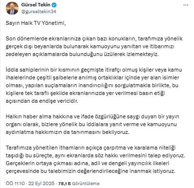 "Sayın Halk TV Yönetimi, Son dönemlerde ekranlarınıza çıkan bazı konukların, tarafımıza yönelik gerçek dışı beyanlarda bulunarak kamuoyunu yanıltan ve itibarımızı zedeleyen açıklamalarda bulunduğunu üzülerek izlemekteyiz." diyen Gürsel Tekin "İddia sahiplerinin bir kısmının geçmişte itirafçı olmuş kişiler veya kamu ihalelerinde çeşitli şaibelerle anılmış ortaklıklar içinde yer alan isimler olması, yapılan suçlamaların inandırıcılığını sorgulatmakla birlikte, bu kişilere tek taraflı şekilde ekranlarınızda yer verilmesi basın etiği açısından da endişe vericidir." ifadelerini kullandı.