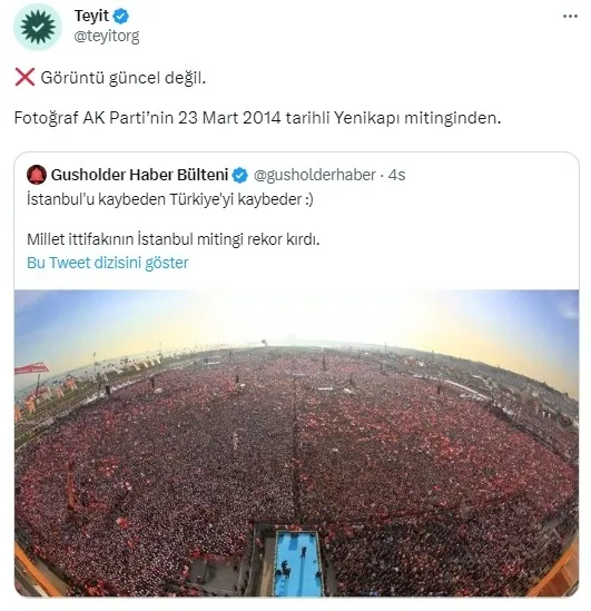 CHP'ye yakınlığıyle bilinen teyit.org tarafından yayınlanan "6 Mayıs Millet İttifakı İstanbul mitinginden olduğu iddia edilen fotoğraf" başlıklı haberde CHP mitingi diye paylaşılan görsellerin İstanbul Yenikapı'da 23 Mart 2014'te düzenlenen AK Parti mitingine ait olduğu kabul edildi.