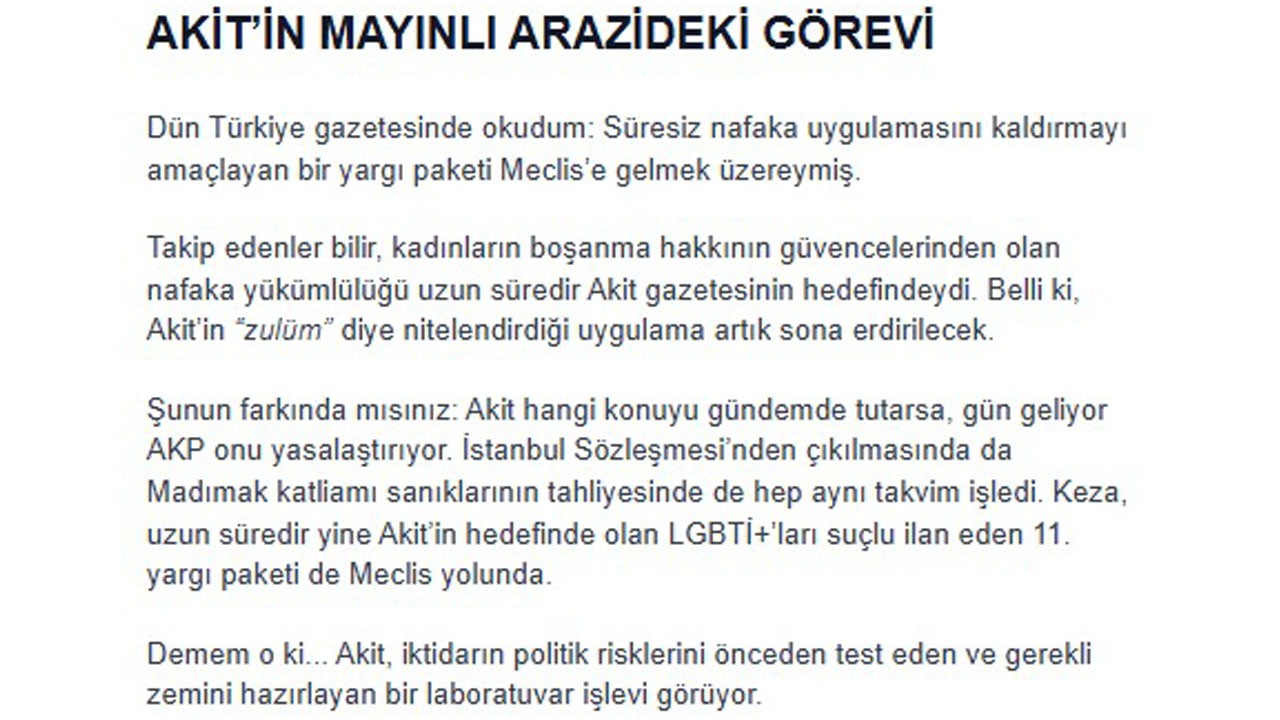 “Süresiz nafaka uygulamasını” kaldırmayı amaçlayan bir yargı paketinin Meclis’e gelmek üzere olduğunu ve “Akit’in ‘zulüm’ diye nitelendirdiği bu uygulamanın da artık sona erdirileceğini” istemeye istemeye itiraf eden Pehlivan, şu ifadeleri kullandı: “Şunun farkında mısınız: Akit hangi konuyu gündemde tutarsa, gün geliyor AKP onu yasalaştırıyor. İstanbul Sözleşmesi’nden çıkılmasında da Madımak katliamı sanıklarının tahliyesinde de hep aynı takvim işledi. Keza, uzun süredir yine Akit’in hedefinde olan LGBTİ+’ları suçlu ilan eden 11. yargı paketi de Meclis yolunda. Demem o ki... Akit, iktidarın politik risklerini önceden test eden ve gerekli zemini hazırlayan bir laboratuvar işlevi görüyor.”