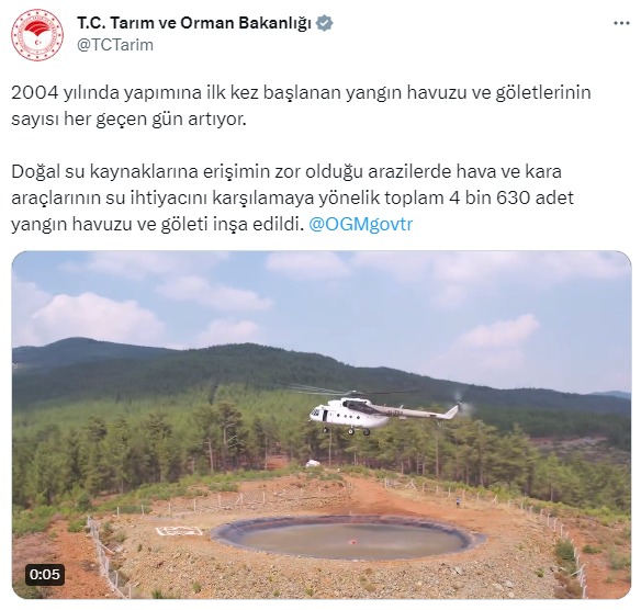 Konuya ilişkin bakanlık tarafından yapılan paylaşımda, “2004 yılında yapımına ilk kez başlanan yangın havuzu ve göletlerinin sayısı her geçen gün artıyor. Doğal su kaynaklarına erişimin zor olduğu arazilerde hava ve kara araçlarının su ihtiyacını karşılamaya yönelik toplam 4 bin 630 adet yangın havuzu ve göleti inşa edildi” şeklinde bilgi verildi.