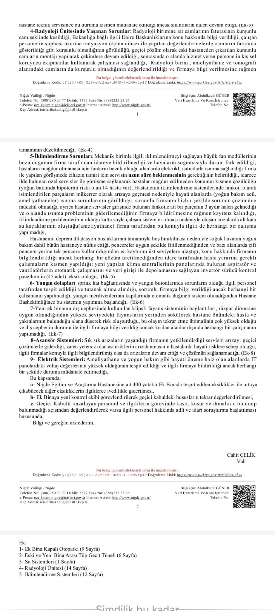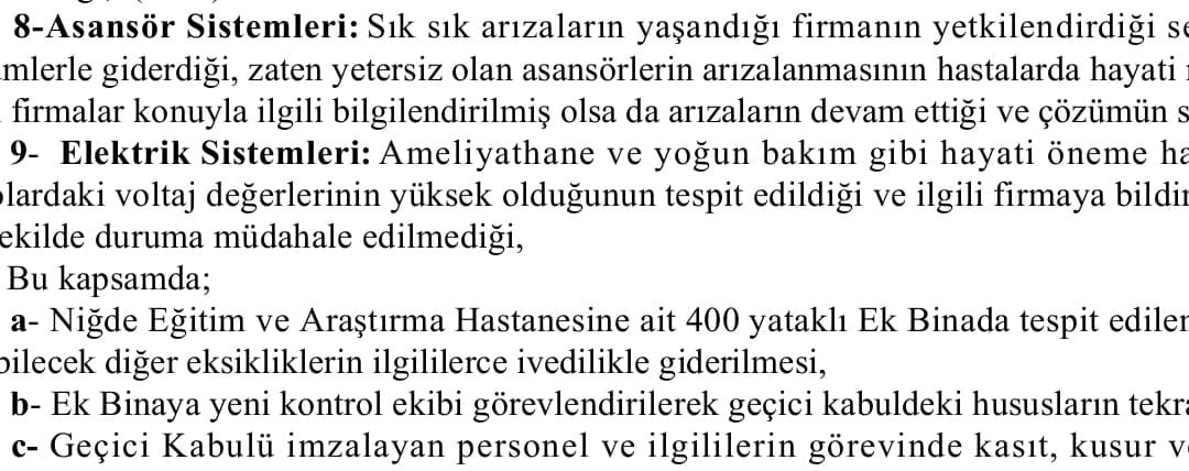 Hastanenin başhekimliği tarafından birçok teknik eksikliğin tespit edildiği, bu eksikliklerin sözlü ve yazılı olarak ilgili birimlere iletilmesine rağmen gerekli adımların atılmadığı dokuz ay geçtikten sonra ortaya çıktı.