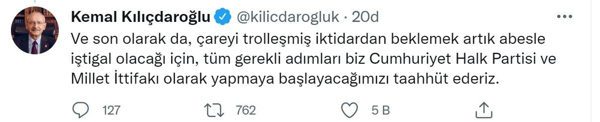 CHP Genel Başkanı Kemal Kılıçdaroğlu, kriz dönemini adeta siyasi ranta çevirdi. CHP lideri sosyal medya hesabından yaptığı açıklamada, “Orman yangınlarını önleme konusunda, iktidarın sorumluğunu yerine getiremediğini bildiğimiz için iklim master planını biz, Millet ittifakı olarak hazırlayacağız. Ayrıca yangından kim zarar gördüyse kayıt altına alınmalıdır. Ve son olarak da, çareyi trolleşmiş iktidardan beklemek artık abesle iştigal olacağı için, tüm gerekli adımları biz Cumhuriyet Halk Partisi ve Millet İttifakı olarak yapmaya başlayacağımızı taahhüt ederiz” dedi.