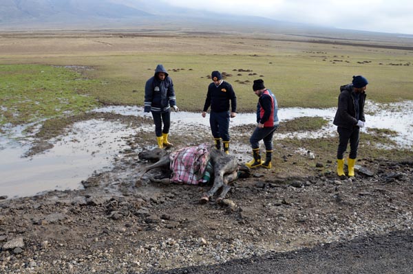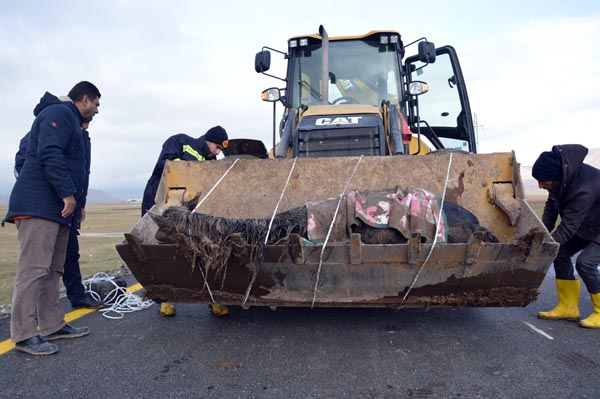 Bölgede etkili olan soğuk havaya rağmen büyük bir özveri gösteren ekipler, yaralı atı kepçe ve halat yardımıyla yol kenarından çıkardı.