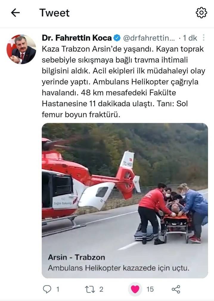 Trabzon'un Arsin ilçesinde önceki gün su hattı çalışması sırasında yaralanan işçinin ambulans helikopterle hastaneye ulaştırılmasını Sağlık Bakanı Fahrettin Koca sosyal medya hesabından paylaştı.