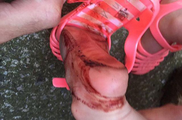 Lisa Conner (26)'ın minik kızına aldığı doğum günü hediyesi pembe silikon sandaletler, 2 yaşındaki Esmé’nin ayağını kan gölüne çevirdi.