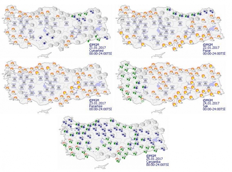 Meteoroloji Genel Müdürlüğü tarafından yapılan son değerlendirmelere göre; Ülkemiz genelinin parçalı ve çok bulutlu, Doğu Karadeniz, Afyonkarahisar, Karaman, Mardin, Şırnak, Hakkari ve Konya’nın güney ve batısı ile Van’nın güney, Şanlıurfa’nın doğu kesimlerinin yağışlı geçeceği tahmin ediliyor. Yağışların; genellikle karla karışık yağmur ve kar, Doğu Karadeniz kıyıları ile Mardin çevrelerinde yağmur şeklinde olması bekleniyor. İç ve doğu kesimlerde buzlanma ve don olayı ile birlikte bu sabah ve gece saatlerinde yer yer sis ve pus hadisesi görüleceği tahmin ediliyor.