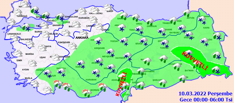 Meteoroloji Genel Müdürlüğü tarafından yapılan son değerlendirmelere göre: Ülkemiz genelinin çok bulutlu, Çanakkale, İzmir ile Aydın'ın kıyı kesimleri dışında kalan tüm bölgelerimizin aralıklı yağışlı geçeceği tahmin ediliyor. Yağışların genellikle yağmur ve sağanak, Batı Karadeniz'in iç kesimleri ile yarın zamanla İç Ege, Batı Akdeniz'in iç kesimleri İç Anadolu, Karadeniz’in iç kesimleri ile Doğu Anadolu’nun kuzey ve doğusunda karla karışık yağmur ve kar şeklinde olması bekleniyor. Yağışların Doğu Akdeniz, Orta ve Doğu Karadeniz'in iç kesimleri, Doğu Anadolu, Güneydoğu Anadolu'nun kuzey ve doğusu ile Antalya’nın doğusu ve Konya çevrelerinde kuvvetli olacağı tahmin ediliyor. Karadeniz'in iç ve yüksek kesimleri ile Doğu Anadolu'da yüksek kar örtüsüne sahip eğimli bölgelerde çığ riski bulunmaktadır. İç ve doğu kesimlerde buzlanma ve don olayı bekleniyor.