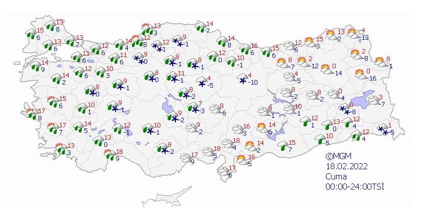 Meteoroloji Genel Müdürlüğü tarafından yapılan son değerlendirmelere göre: Yurt genelinin parçalı, yer yer çok bulutlu, yarın (Cuma) Marmara, Ege ve Batı Karadeniz ile İç Anadolu'nun kuzeybatı, Doğu Anadolu'nun güneydoğu ve Güneydoğu Anadolu'nun doğu kesimlerinin yağışlı geçeceği, yağışların genellikle yağmur ve sağanak, İç Ege, İç Anadolu ve Batı Karadeniz'in yüksek kesimlerinde önce yağmur, zamanla karla karışık yağmur ve yer yer kar şeklinde görüleceği tahmin ediliyor. Akdeniz Bölgesi'nin yüksek kesimlerinde (Toros Dağları), İç Anadolu'nun güneyinde ve doğusunda (Konya, Karaman ve Niğde'nin Toros Dağları kesimi ile Kayseri ve Sivas'ın yüksek kesimleri), Karadeniz Bölgesi'nin iç ve yüksek kesimleri ile Doğu Anadolu Bölgesi'nde yüksek kar örtüsü bulunan eğimli yerlerde çığ riski bulunmaktadır.