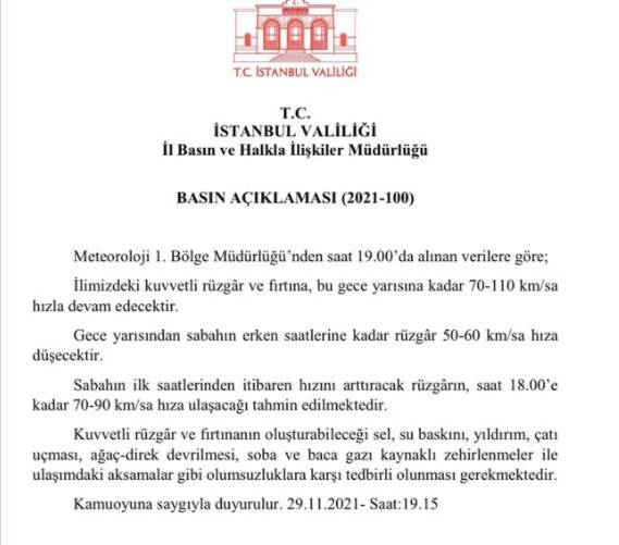 İstanbul Valiliği son olarak vatandaşların etkili fırtınaya karşı dikkatli olmaları yönünde bir açıklama yayımladı. Yapılan açıklamada, “Meteoroloji 1.Bölge Müdürlüğü'nden saat 19.00'da alınan verilere göre; ilimizdeki kuvvetli rüzgar ve fırtına, bu gece yarısında kadar 70,-11 km\sa hızla devam edecektir. Gece yarısından sabahın erken saatlerine kadar rüzgar 50-60 km/sa hıza düşecektir. Sabahın ilk saatlerinden itibaren hızını arttıracak rüzgarın saat 18.00'e kadar 70-90 km\sa hıza ulaşacağı tahmin edilmektedir. Kuvvetli rüzgar ve fırtınanın oluşturabileceği sel, su baskını, yıldırım, çatı uçması, ağaç-direk devrilmesi, soba ve baca gazı kaynaklı zehirlenmeler ile ulaşımdaki aksamalar gibi olumsuzluklara karşı tedbirli olunması gerekmektedir" denildi.