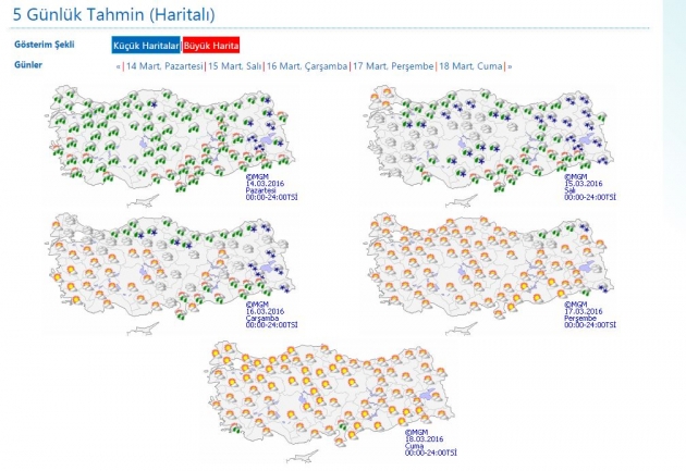 Yapılan son değerlendirmelere göre; Ülkemiz genelinin parçalı çok bulutlu ve yağışlı geçeceği tahmin ediliyor. Genellikle yağmur ve sağanak, akşam ve gece saatlerinde Marmara'nın güneydoğusu, Kuzey Ege'nin iç kesimleri, İç Anadolu'nun kuzey ve doğusu, Karadeniz'in iç kesimleri ile Doğu Anadolu'nun doğusunda karla karışık yağmur ve yer yer kar şeklinde görülecek yağışların; Güney Ege kıyıları, Antalya, Osmaniye, Hatay, Kahramanmaraş, Kocaeli, Sakarya, Düzce ve Adana'nın kıyı kesimleri ile öğle saatlerinden sonra Kuzey Ege'nin iç kesimleri, Balıkesir, Eskişehir, Ankara'nın güney kesimleri, Kırıkkale, Yozgat, Sivas, Kırşehir, Tokat, Ordu, Giresun, Kahramanmaraş, Elazığ, Tunceli, Bingöl, Muş, Bitlis, Şırnak, Hakkari, Adıyaman, Diyarbakır, Batman ve Siirt çevrelerinde kuvvetli olması bekleniyor. Doğu Karadeniz kıyılarında sabah saatlerinde sis hadisesinin görüleceği tahmin ediliyor. Rüzgarın Marmara, Kuzey Ege, Akdeniz ve Batı Karadeniz'in batısında yer yer fırtına (60-90 km/sa) şeklinde esmesi bekleniyor. Gece saatlerinde Karadeniz'in iç kesimleri, İç Ege, İç Anadolu'nun kuzey ve doğusu ile Doğu Anadolu'nun doğusunda buzlanma ve don olayı bekleniyor.