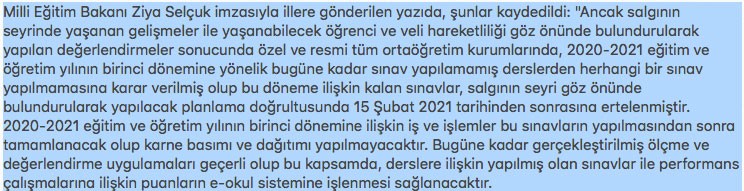 2020 - 2021 eğitim öğretim yılının ikinci dönemi 15 Şubat 2021 Pazartesi günü başlayacak. Milli Eğitim Bakanı Ziya Selçuk imzasıyla illere gönderilen "sınavların ertelenmesi" konulu yazıda, Bakanlığa bağlı resmi ve özel örgün ortaöğretim kurumlarında eğitim ile öğretim faaliyetlerinin, 4-22 Ocak 2021 tarihleri arasında uzaktan eğitim yoluyla devam edeceği ve bu tarihler arasında eğitim kurumlarında sadece ölçme ile değerlendirme uygulamalarının yapılacağı belirtildi. Resmi ve özel örgün ortaöğretim kurumlarında eğitim, öğretim, yönetim ve işleyişe ilişkin usul ve esasların ilgili yönetmelik hükümleri çerçevesinde yürütüleceği ve 2020-2021 eğitim ve öğretim yılının ikinci döneminin 15 Şubat 2021 Pazartesi günü başlayacağının daha önce açıklandığı hatırlatıldı.