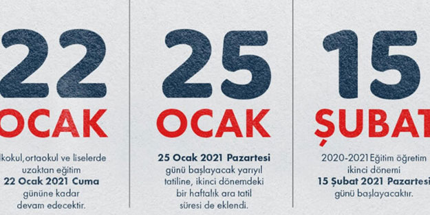 Milli Eğitim Bakanlığı korona salgını tedbirleri kapsamında ilkokul, ortaokul ve liselerde uzaktan eğitim, 2020 – 2021 eğitim öğretim yılında yarıyıl tatiline 22 Ocak 2021 Cuma gününe kadar devam etti. Milyonlarca öğrenci 22 Ocak’ta yarıyıl tatiline girdi. Milli Eğit Bakanlığı tatil takvimine göre; 25 Ocak'ta başlayan yarıyıl tatili üç hafta olacak. Tatil 15 Şubat'ta sona erecek.
