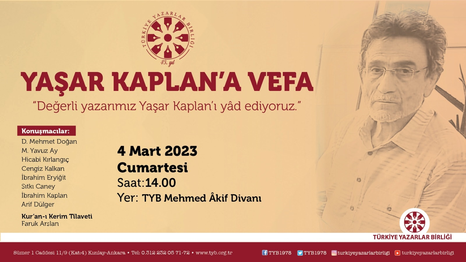 Yazar, mütefekkir, Türkiye Yazarlar Birliği üyesi merhum Yaşar Kaplan vefa programıyla yâd edilecek.