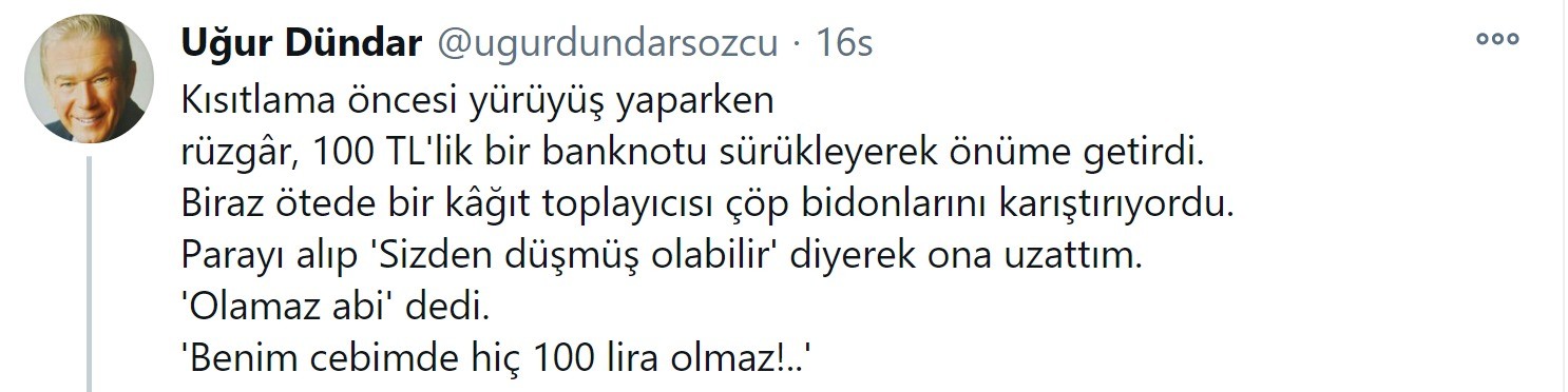 Dündar, “Kısıtlama öncesi yürüyüş yaparken rüzfar, 100 TL'lik bir banknotu sürükleyerek önüme getirdi. Biraz ötede bir kağıt toplayıcısı çöp bidonlarını karıştırıyordu. Parayı alıp 'Sizden düşmüş olabilir' diyerek ona uzattım. 'Olamaz abi' dedi. 'Benim cebimde hiç 100 lira olmaz!..'” diye yazdı.