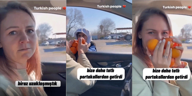 Sosyal medyada paylaşılan görüntüler gündem oldu. Rus turistler yol üstünde gördükleri bir bahçede bulunan ağaçtan portakal aldı. Rus turistin ağaçtan portakal aldığını gören kadın ise ilerleyen arabanın peşinden giderek aracı durdurdu. Rus turistler kendilerine kızacağını düşünen yaşlı teyzeden hiç beklemedikleri bir tepki gördü. Elinde portakalla arabanın camına giden yaşlı kadın Rus turistlere daha fazla portakal vererek Türklerin ne kadar misafirperver olduğunu gösterdi. Turistler o anları ise şaşkınlıkla sosyal medya hesabından paylaştı.