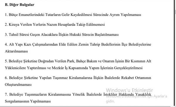Raporun usulsüzlük olarak kayıt altına aldığı 6. Bulgusunda ise şu ifadeler yer alıyor: “Belediye şirketine yapılan taşınmaz kiralamalarına ilişkin ihalelerde rekabet ortamının oluşturulmaması… Kurum tarafından gerçekleştirilen taşınmaz kiralamalarına ilişkin hesap ve kayıtların incelenmesi sonucunda; belediye şirketi üzerinde kalan taşınmaz kiralamalarına ilişkin ihalelerde rekabet ortamının oluşturulmadığı, şartnamelere yazılan bazı hükümlerle ihalelerin rekabetten uzak hale getirildiği, neredeyse tüm ihalelere tek teklif sahibi olan Belediye Şirketinin girerek ihaleleri kazandığı tespit edilmiştir” CHP’li Yavaş’ın AK Partili ilçe belediyeler tarafından engellendiği yönündeki algı operasyonu da Sayıştay tarafından çürütüldü. Raporun 41. Sayfasında Yavaş yönetiminin ilçe belediyelerin hakkı olan paranın üzerine nasıl yattığı, “Alt Yapı Kazı Çalışmalarından Elde Edilen Zemin Tahrip Bedellerinin İlçe Belediyelerine Aktarılmaması… İlçe belediyelerinin sorumluluk alanlarındaki yerlerde yapılan kazı çalışmalarından elde edilen zemin tahrip bedellerinin bazı ilçe belediyelerine aktarılmadığı tespit edilmiştir” ifadeleriyle kayıt altına alınıyor.
