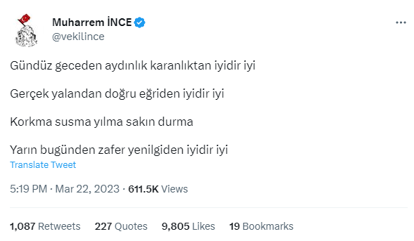 Yavuz Ağıralioğlu'nun açıklamasının hemen ardından Memleket Partisi Genel Başkanı ve cumhurbaşkanı adayı Muharrem İnce'den bir paylaşımda bulundu.