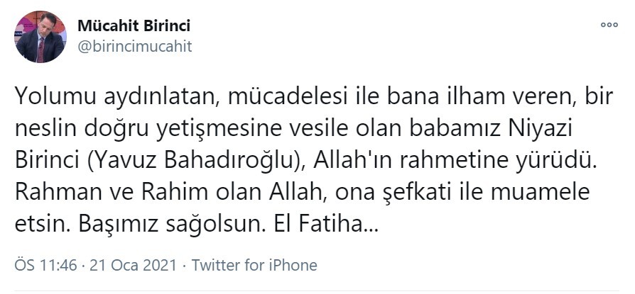 "Yavuz Yolumu aydınlatan, mücadelesi ile bana ilham veren, bir neslin doğru yetişmesine vesile olan babamız Niyazi Birinci (Yavuz Bahadıroğlu), Allah'ın rahmetine yürüdü. Rahman ve Rahim olan Allah, ona şefkati ile muamele etsin. Başımız sağolsun. El Fatiha..."