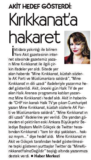 Yazarlarının milleti açık açık tehdit etmesini, türlü türlü palavralarını ve ağır hakaretlerini görmezden gelen kağıt parçası, küstahlığa “küstahlık” diyerek “durum tespiti” yapan Akit’in, Kırıkkanat’ı hedef gösterdiğini iddia etti.