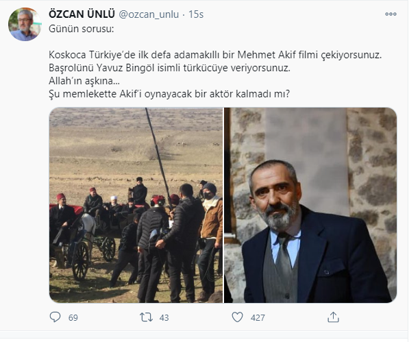 İstiklal Şairi Mehmet Akif Ersoy'un hayatını konu alacak filmde başröl oyuncusunun Yavuz Bingöl olmasına Yazar Özcan Ünlü tepki gösterdi.