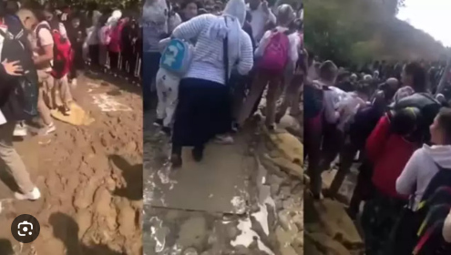 Videoda, öğrencilerin ve velilerin okul yolunda yağmur nedeniyle çamura dönen yolda yürümekte zorluk çektiği görüldü.