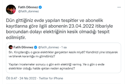 Twitter hesabından Kılıçdaroğlu'nun yalanını paylaşan Enerji ve Tabii Kaynaklar Bakanı Fatih Dönmez, "Dün gittiğiniz evde yapılan tespitler ve abonelik kayıtlarına göre ilgili abonenin 23.04.2022 itibariyle borcundan dolayı elektriğinin kesik olmadığı tespit edilmiştir." dedi.