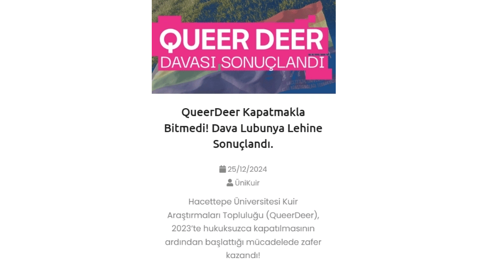 “Hacettepe Üniversitesi Kuir Araştırmaları Topluluğu, 2023’te hukuksuzca kapatılmasının ardından başlattığı mücadelede zafer kazandı. Adalet, lubunya lehine yerini buldu. Queer Deer kapatmakla bitmez!”