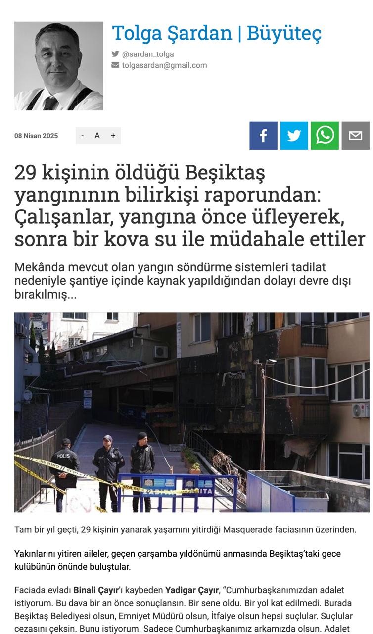 CHP’li Beşiktaş Belediyesi’ni ve seküler sermayeyi aklamaya çalışan T24 yazarı Tolga Şardan, 29 kişinin öldüğü gece kulübü yangınında işçilerin kusurlu olduğunu ileri sürdü. Bu durum ayrıca, solcu geçinenlerin CHP ve seküler sermaye söz konusu olunca, emekçi/işçi sınıfını bile nasıl hedef alabileceğini gözler önüne serdi.